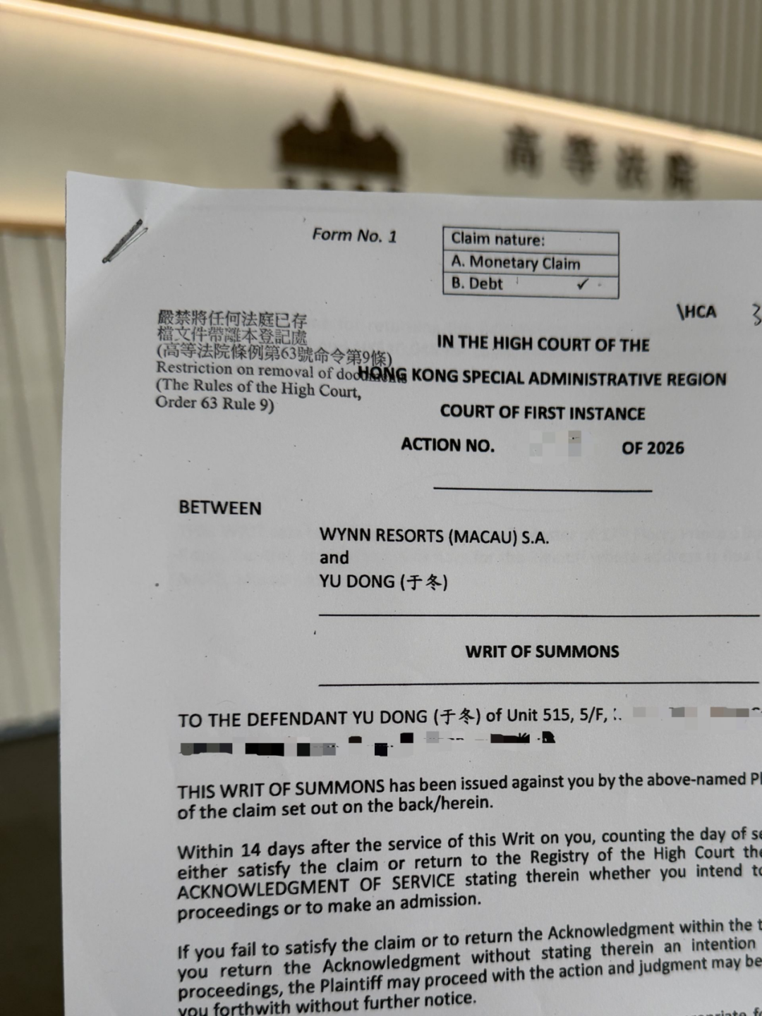 3月10日,《每日经济新闻》曝光起诉书显示,永利澳门3月3日向香港高等法院起诉于冬。起诉书称,于冬2024年5月获1000万港元信贷额度,签署提款确认书后偿还部分款项。2026年1月,永利澳门用其担保的空白支票兑取约573万港元余额遭退票,于冬2月再还100万港元,仍欠约473万港元本金,协议约定欠款按年利率18%计息,且需承担追收费用。