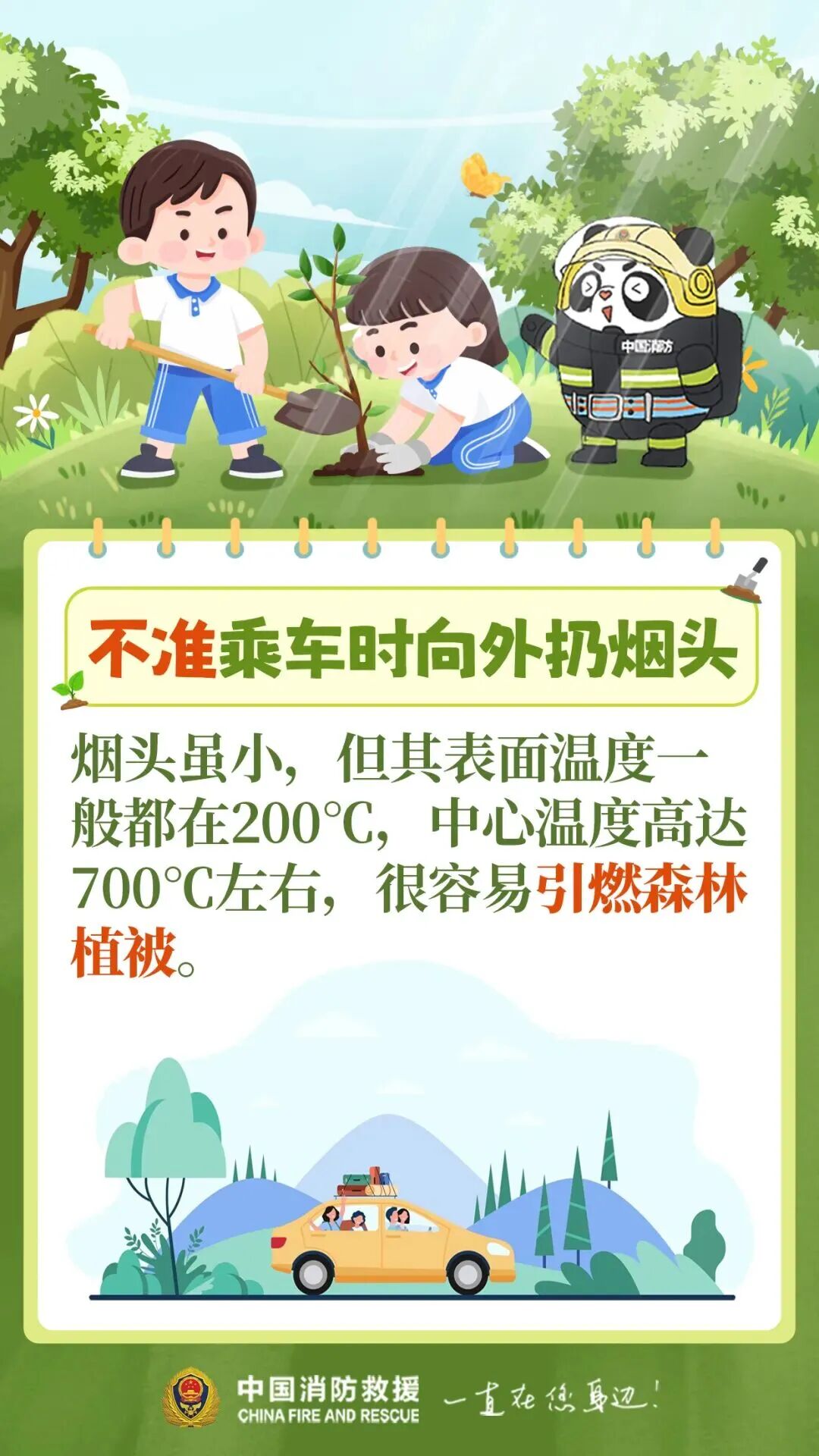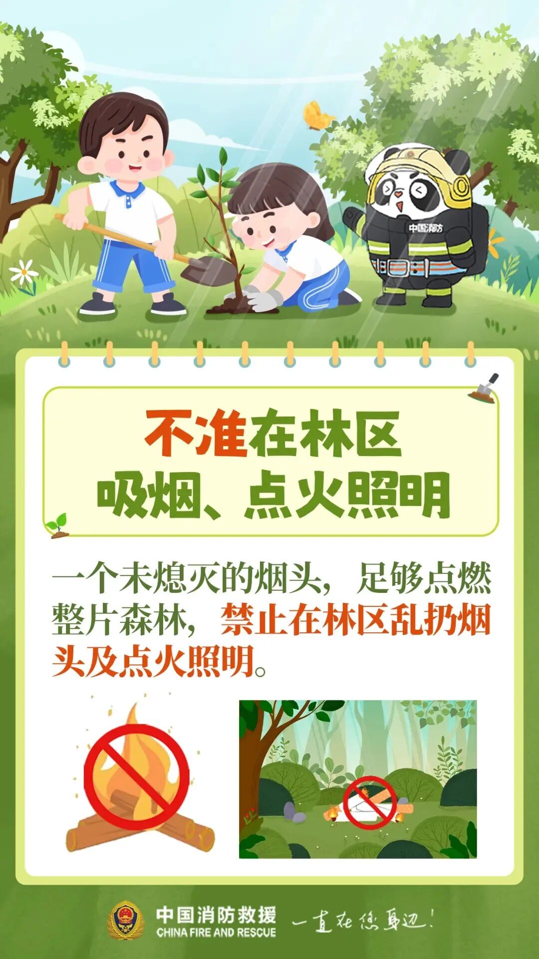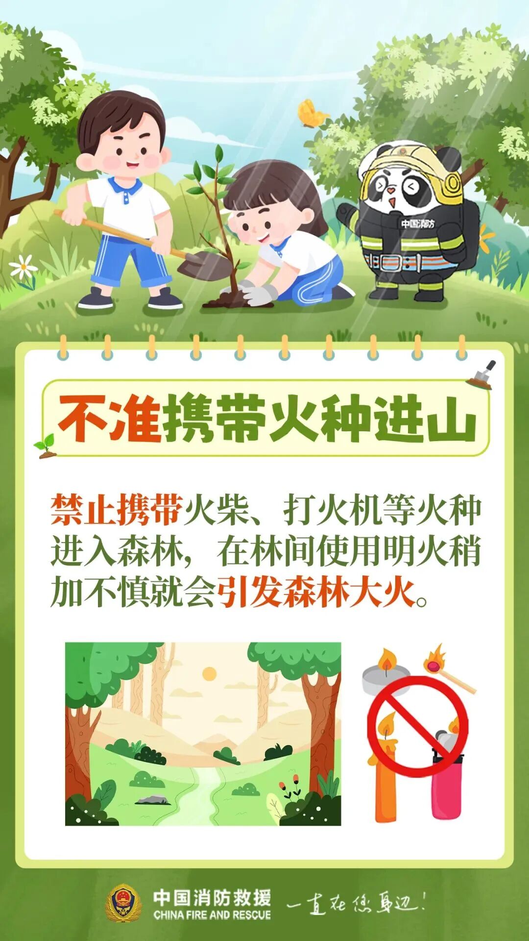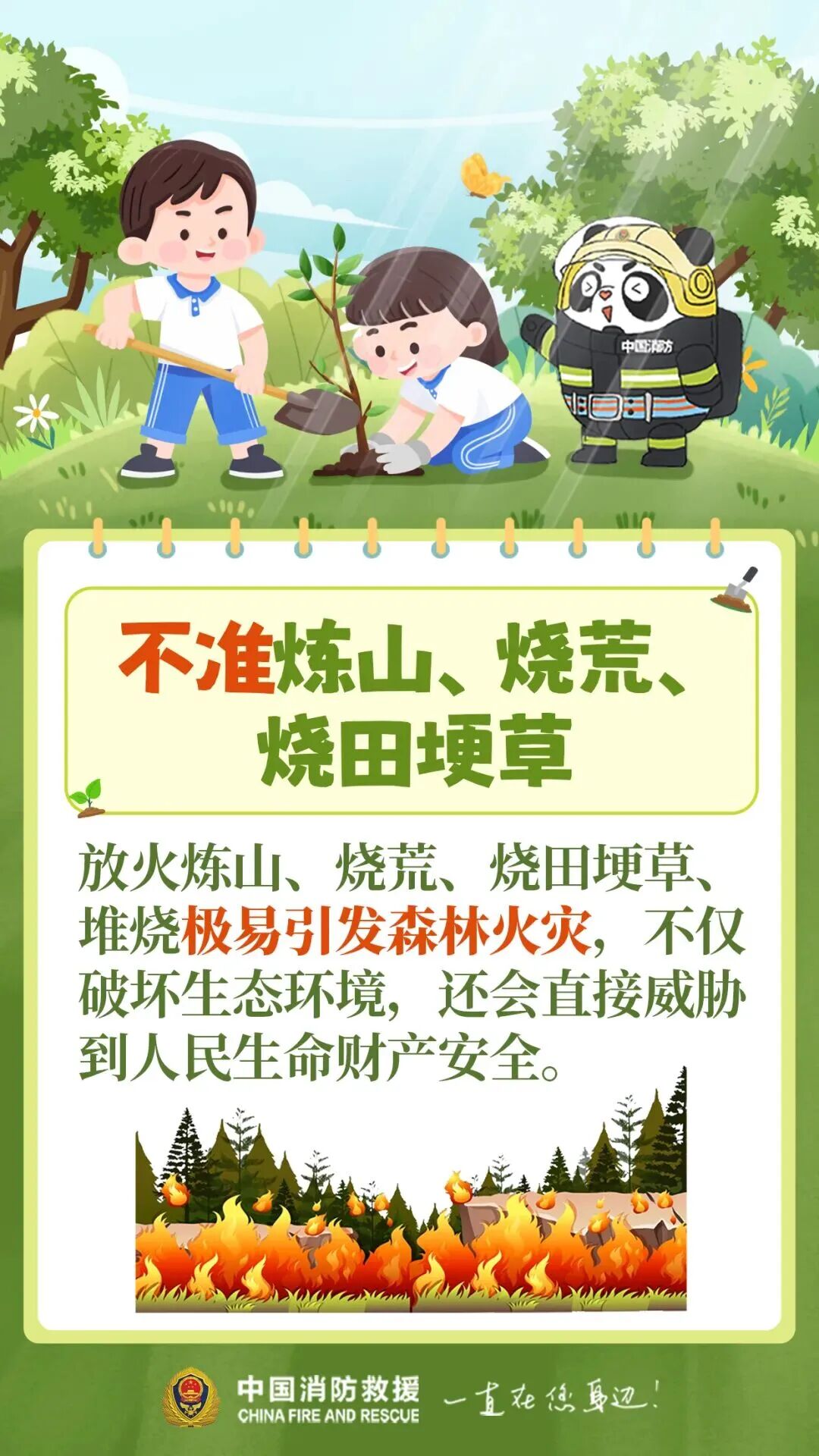森林火灾范围广、损失重、火势猛,不仅烧毁树木、伤害动物,还会破坏生态平衡,导致土壤贫瘠、自然更新能力下降。在此提醒大家提高防火意识,切勿在野外随意动火,进入山林需牢记六“不准”事项。
