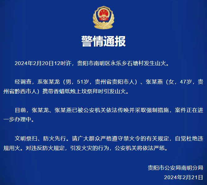 案例一:2024年2月20日,贵州贵阳市南明区永乐乡石塘村山火,系张某龙、张某燕上坟祭拜使用香蜡纸烛引发,二人已被公安机关依法处理。