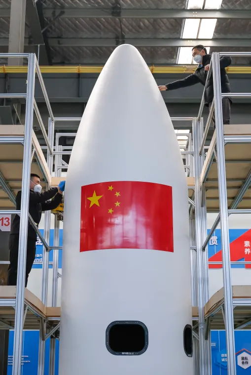工人铺贴火箭配套产品。