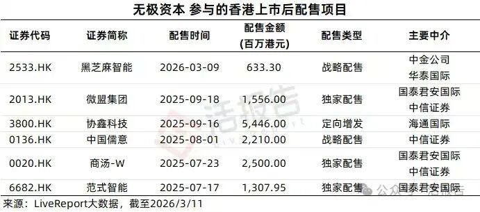 2025年以来,无极资本以独家认购方式参与多家港股上市公司H股配售,包括黑芝麻智能、范式智能、微盟集团、协鑫科技、商汤、中国儒意等。香港分析师指出,无极资本或通过做空某只股票,再以配股方式回购套利。