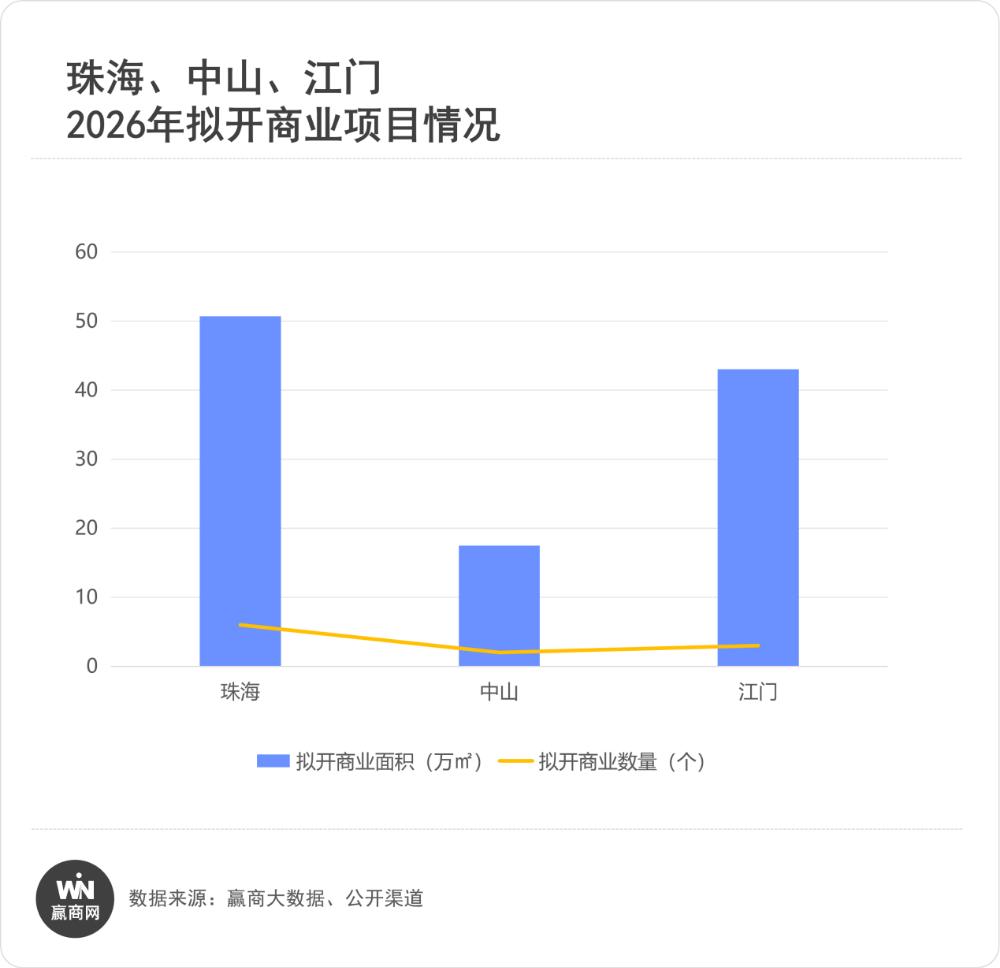 从城市分布来看,珠海有6个项目,拟新增商业面积50.7万平方米,无论是新开项目数量还是体量,都是商业供应的主力;江门紧随其后,有3个筹开项目,商业增量达44万平方米,正加速追赶珠海;中山则有2个项目,商业体量为17.5万平方米。