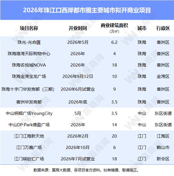 根据赢商大数据的不完全统计,2026年珠海、中山、江门共有11个商业项目计划开业,将为珠江口西岸都市圈带来超过111万平方米的商业供应。(文末附有2026年珠海、中山、江门筹开集中式商业项目盘点清单)