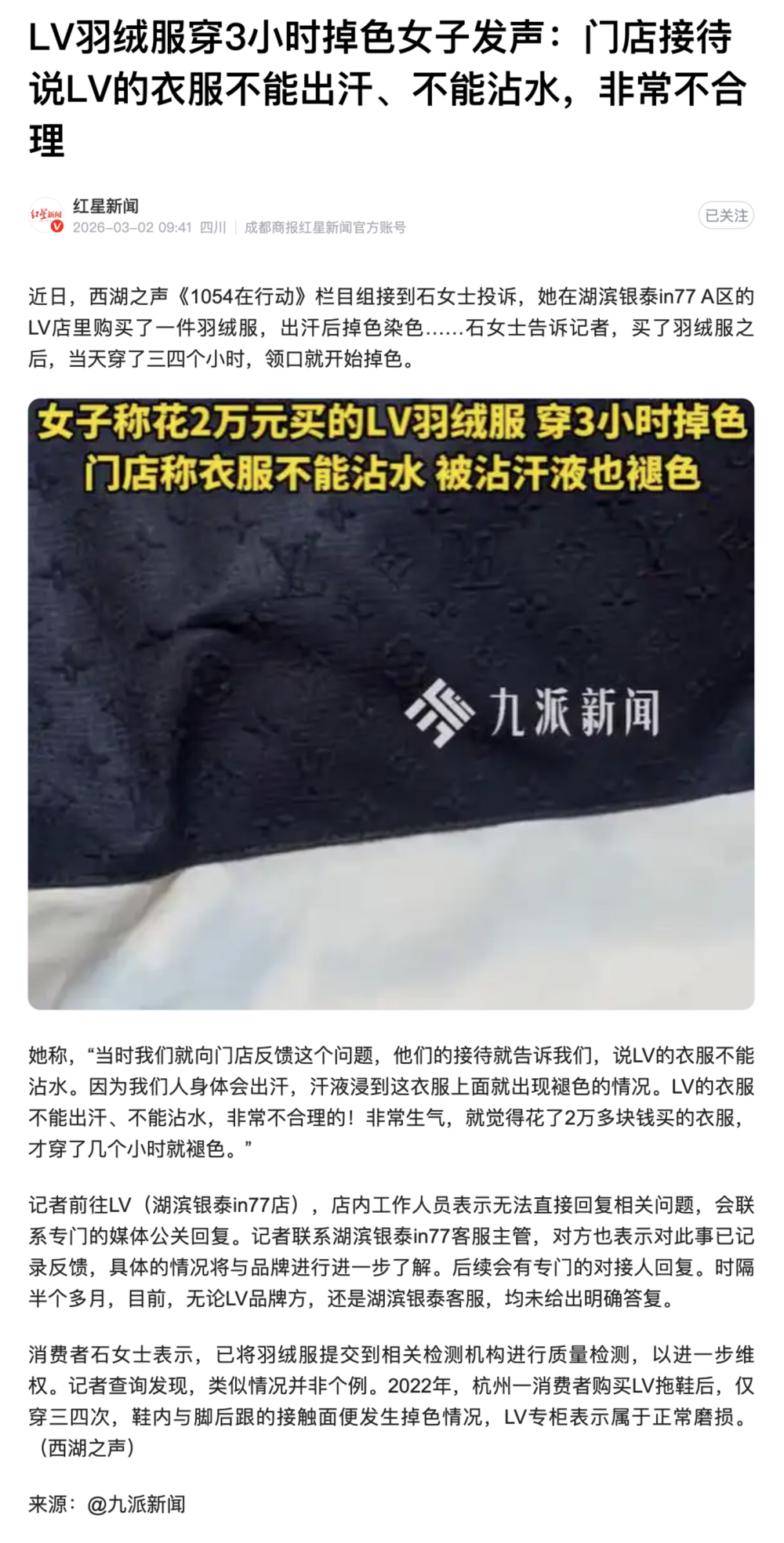 后台有读者发来一条新闻,问我怎么看这件事——售价3万的羽绒服一出汗就掉色,难道这个品牌有问题?