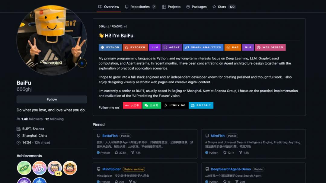 故事的主角叫郭航江,在GitHub上的主页名为BaiFu。从个人简介可知,他就读于北京邮电大学,主要使用Python编程语言,长期关注深度学习、大语言模型、图计算及智能体系统领域。过去几个月,他把大部分精力投入到智能体架构设计与实际应用场景的探索中。