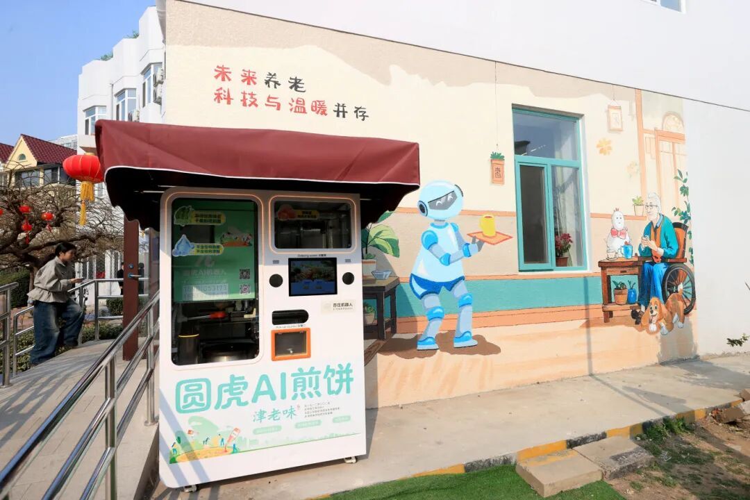 驿站一层的智能餐厨区,实现了从进门到用餐的全流程智能化服务。炒菜机器人按标准精准烹制各类菜肴,口味稳定适口;送餐机器人灵活穿梭于餐区之间,精准完成配餐配送;外侧空间里,已取得热食类餐饮《食品经营许可证》的“圆虎煎饼机器人”,3分钟就能标准化制作美味煎饼,让用餐体验高效便捷又贴心安全。二层托育区专为婴幼儿打造,引入悟空二代机器人、画画机器人、足球机器人等陪伴类机器人,构建起寓教于乐的互动空间,让孩子在快乐玩耍中提升对科技的认知。三层集康养、休闲、日间照料于一体,在迎宾机器人的引导下,老年人可按需前往不同区域,体验各类智能机器人。康复理疗区堪称老年人的“健康乐园”,能满足康复训练、健康检测等需求——按摩机器人提供多部位适配的舒适按摩,艾灸机器人智能定穴施灸、控温防烫,健康检测设备可快速完成多项指标检测,外骨骼机器人则帮助老人进行精准、科学的康复训练。闲暇时走进“智慧棋牌室”,与下棋机器人对弈切磋,感受泡茶机器人“一键式”茶艺,让康养时光更添乐趣。
