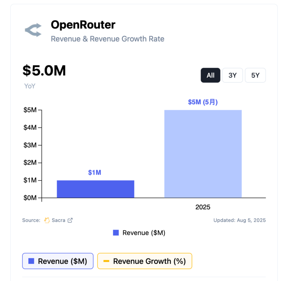 OpenRouter的增长速度惊人:2024年10月月度交易额80万美元,2025年5月已达800万美元。