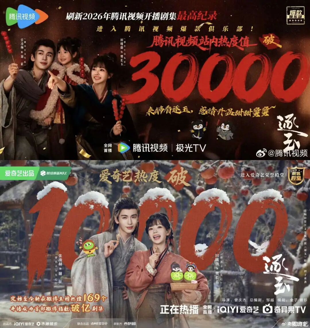 3月6日,张凌赫、田曦薇主演的《逐玉》在腾讯视频、爱奇艺同步开播,腾讯站内热度3天破29000刷新2026纪录,爱奇艺破9500;截至发稿,腾讯热度超3万、爱奇艺超1万。