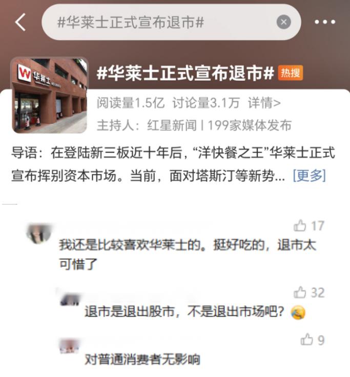 退市消息发布后,引发网友大量讨论,多数人的第一反应是“华莱士要倒闭了?”