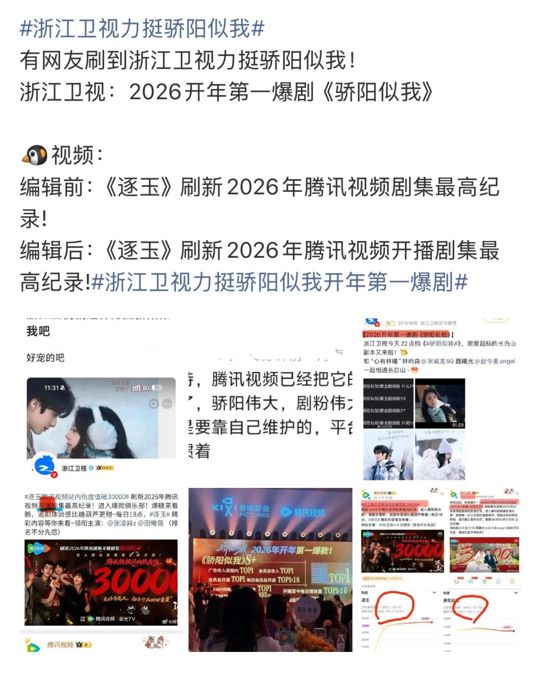 两个月前(1月4日),《骄阳似我》刚以30130的站内热度刷新腾讯视频纪录,被官方认定为“2026开年第一爆款”。随着《逐玉》热度走高,3月12日,腾讯视频将战报措辞从“刷新2026年剧集最高纪录”调整为“刷新2026年开播剧集最高纪录”,默认2025年年末播出的《骄阳似我》不计入榜单。这场关于“开播时间”的界定,让“年度剧集”归属更显微妙。