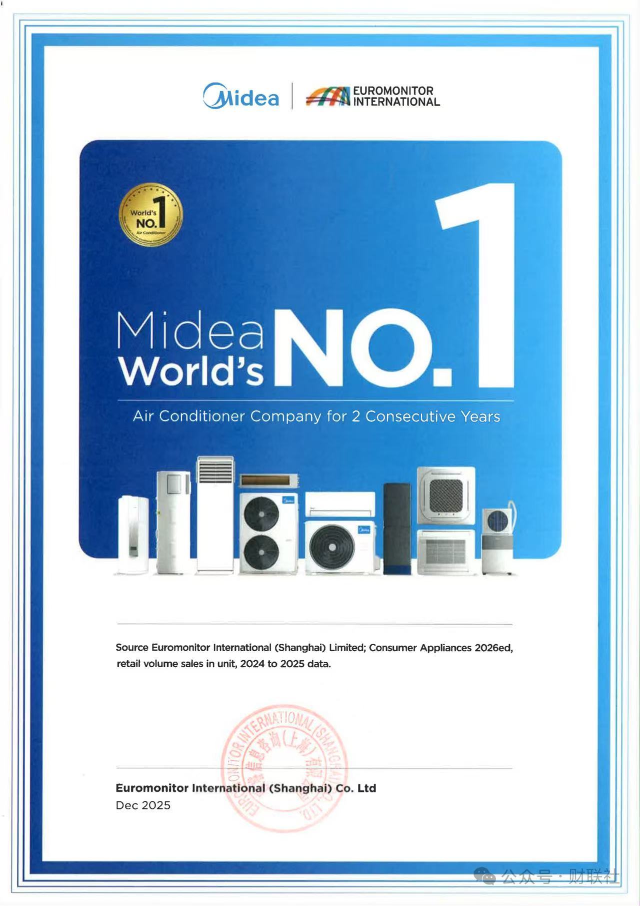 如今,全球市场销售的空调产品中,每4台就有1台来自美的制造。此外,欧睿国际《2026年消费电器》报告显示,美的空调在2025年再次登顶全球销量第一。