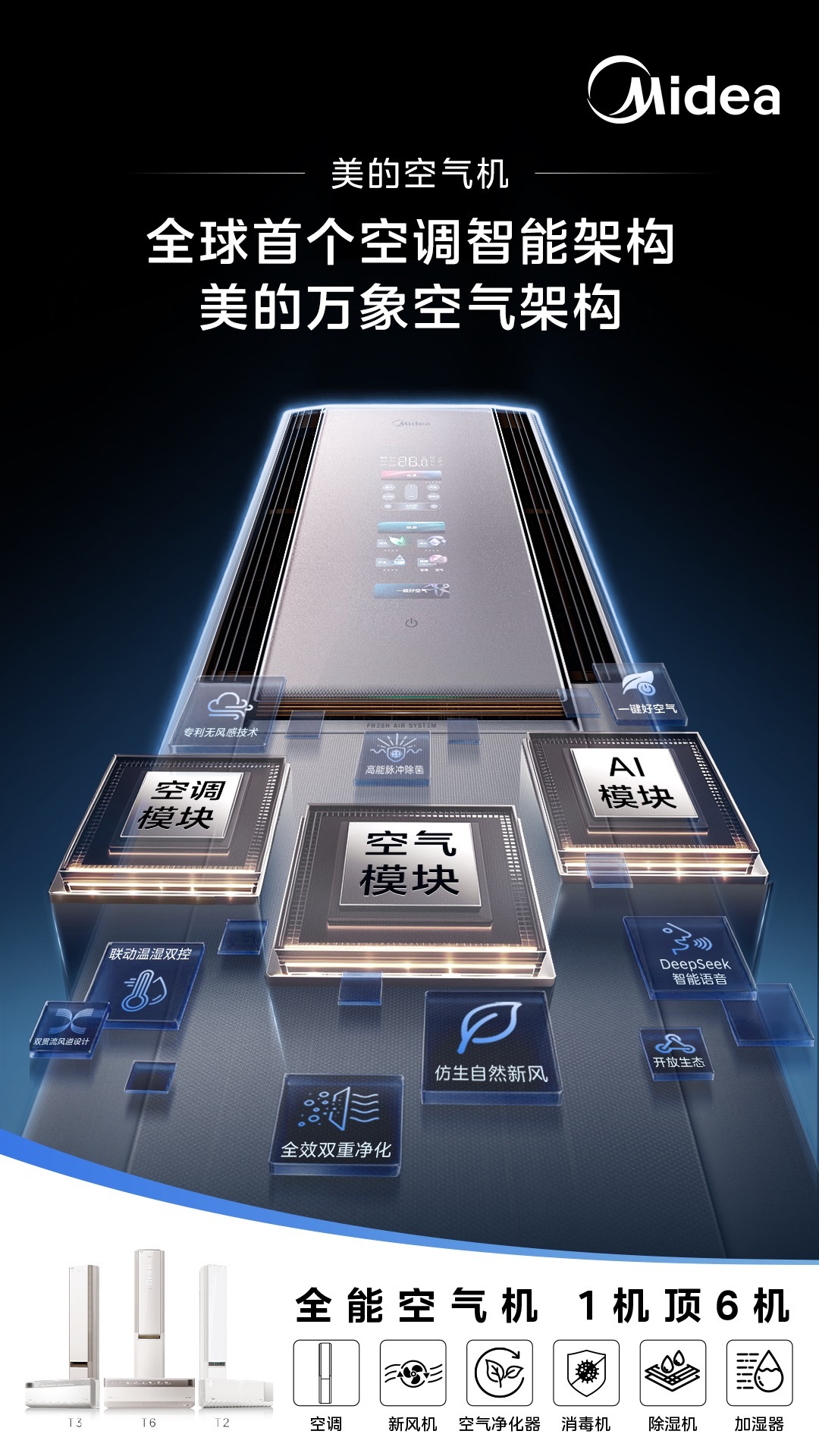 美的空气机家族正是基于万象空气架构诞生的空调行业「新物种」。以旗舰产品美的空气机T6为例,它通过空调模块、空气模块与AI模块的协同,将传统分散的空气能力整合为一套系统,实现真正的「1机顶6机」。