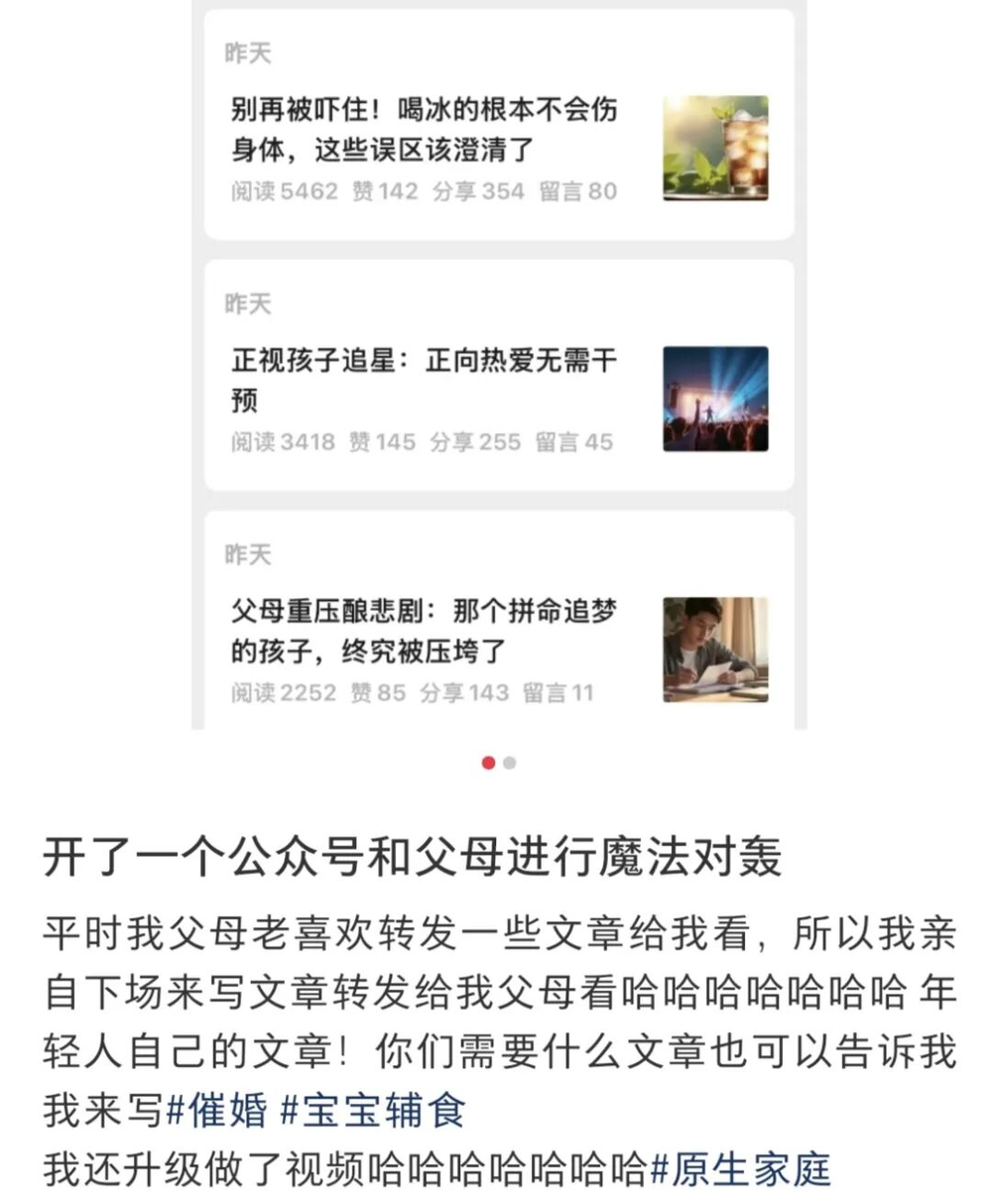 事情源于网友“是草莓味的猫”发帖称,父母总爱转发各类文章给自己,于是他“开了个公众号和父母‘魔法对轰’”,专门撰写“年轻人自己的文章”。