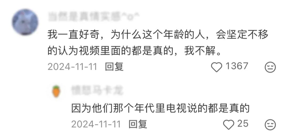 这或许是因为他们年轻时,电视等传统媒体是获取外界信息的重要渠道,媒体机构有严格正规的采编流程,发布的信息被认为经过筛选验证,可信度高。长期的信任积累,让他们对网络短视频、公众号文章等传递的信息更容易产生天然信任感。