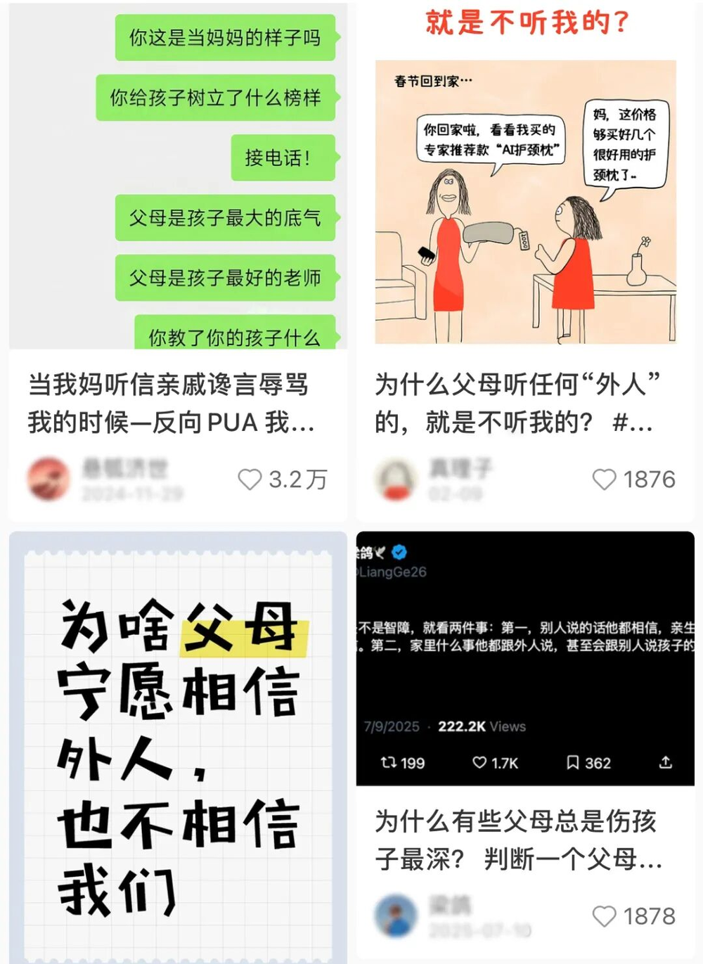 在几十年的生活中,父辈形成了稳定的认知框架:身份决定话语权重,谁更可靠,意见就更值得听。互联网上的“专家”“老师”因被赋予学识渊博、受人尊崇的身份,被视为权威理性的象征;营销号里的陌生人,则因是无关的“过来人”而显得客观公正。