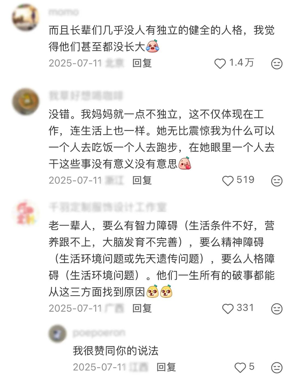 而这几十年间新事物、新观念的更迭,猛烈冲击着他们习得和建立的秩序感,一次次引发“权威受挑战”的心理危机。因此,不是“比起子女更信专家”,而是“专家”的话不仅看似权威,还符合他们固有的价值观念——这更像是时代遗留在一代人身上的思维惯性,而非网友归因的原生家庭阵痛。