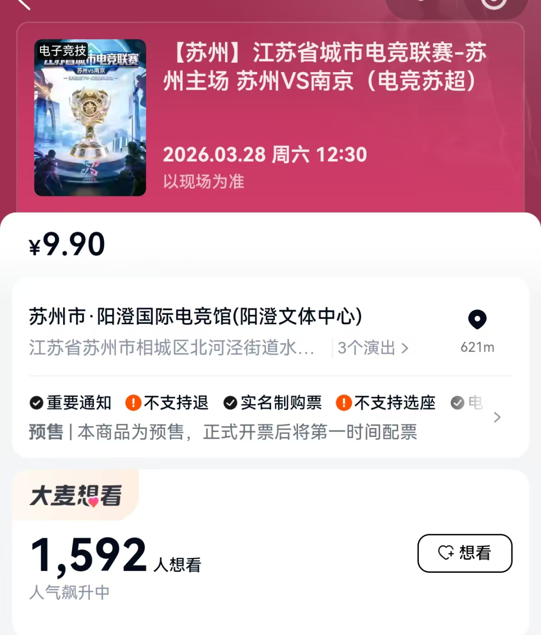 赛事正式售票时间为3月17日(本周二)下午2点,大家可以登录大麦App,直接搜索“电竞苏超”,选择9.9元票价的入口就能完成购票。建议提前完成账号实名认证和支付方式绑定,这样能提高抢票的成功率。需要注意的是,大麦网是唯一的售票渠道。