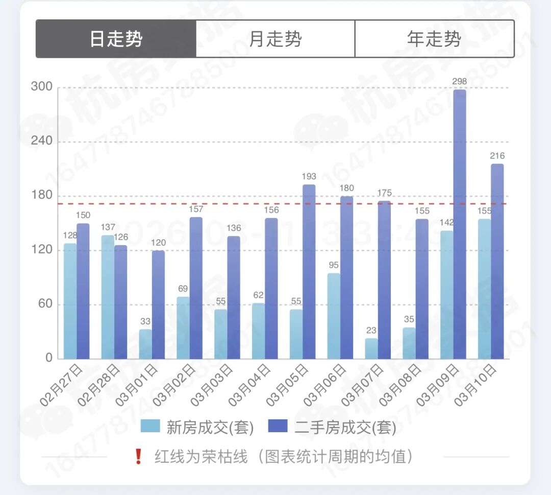 杭房数据显示,3月9日杭州二手房单日网签量从之前不足200套跃升至298套,3月10至11日也都保持在200套以上。截至目前,本月二手房累计成交已超2000套,若维持近期水平,有望冲击六七千套。