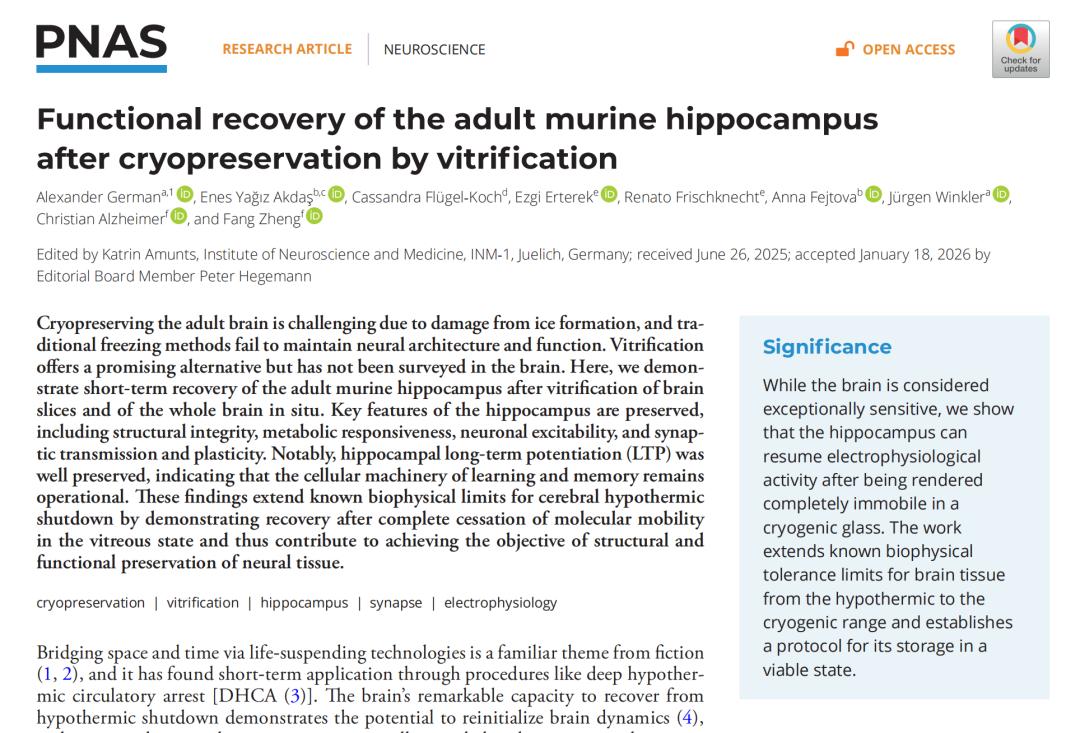 参考文献:1. German, A., Akdaş, E. Y., Flügel-Koch, C., Erterek, E., Frischknecht, R., Fejtova, A., ... & Zheng, F. (2026). Functional recovery of the adult murine hippocampus after cryopreservation by vitrification. Proceedings of the National Academy of Sciences, 123(10), e2516848123.2. https://www.nature.com/articles/d41586-026-00756-w
