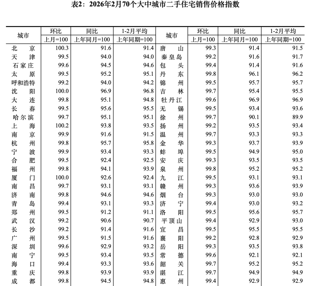 3月16日,国家统计局发布的2026年2月70个大中城市商品住宅销售价格变动数据显示,新房价格环比上涨或持平的城市数量较上月有所增加,一线城市新房价格由环比下降转为持平,北京、上海均环比上涨0.2%。在70个大中城市里,新建商品住宅销售价格环比上涨的城市有10个。