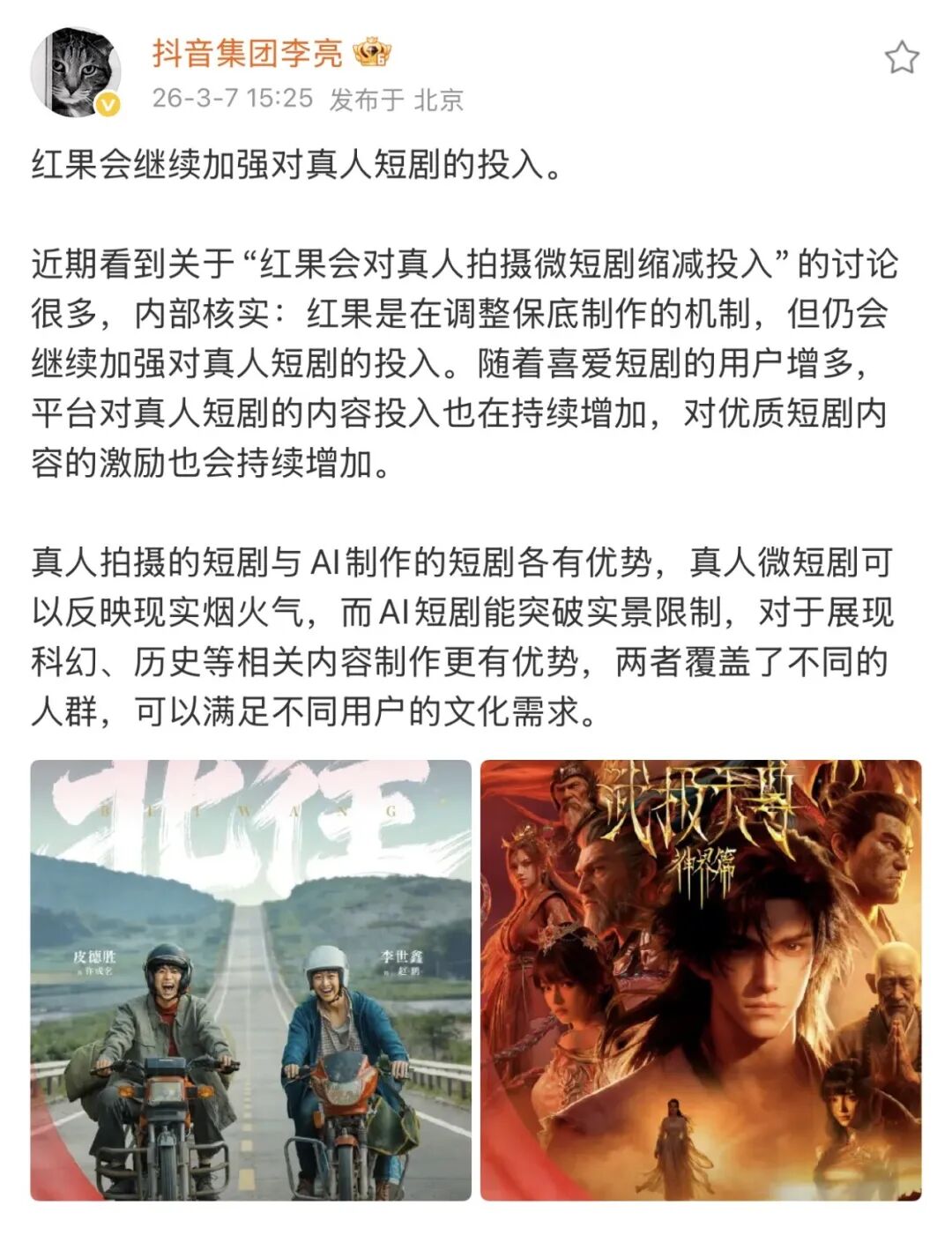 3月7日,抖音集团副总裁李亮发微博回应称,红果会继续加强对真人短剧的投入:“近期看到关于‘红果会对真人拍摄微短剧缩减投入’的讨论很多,内部核实:红果是在调整保底制作的机制,但仍会继续加强对真人短剧的投入。随着喜爱短剧的用户增多,平台对真人短剧的内容投入也在持续增加,对优质短剧内容的激励也会持续增加。”3月9日,红果短剧明确战略方向,称真人短剧仍是行业核心,未来将推动精品化与IP化,同时加大对优质内容的激励力度。