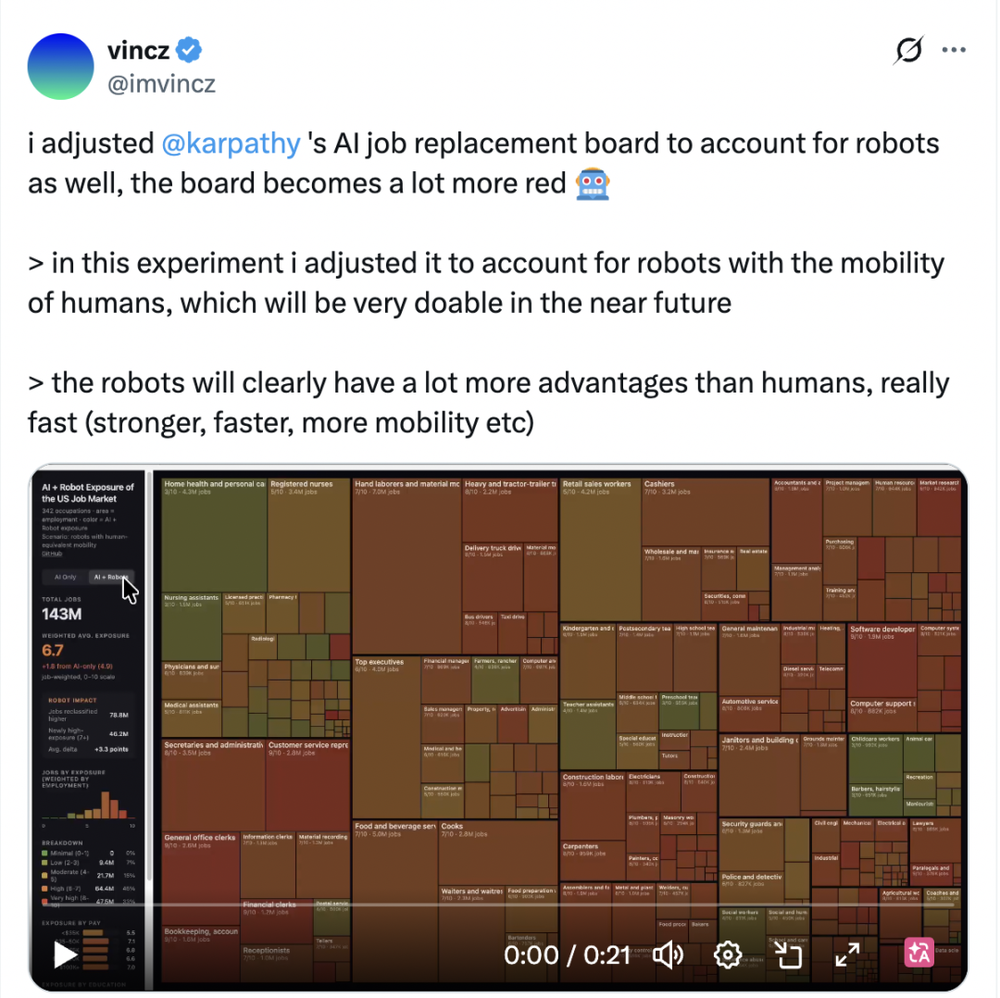 有网友在Karpathy原版图表基础上加入机器人因素,图中低风险区变得更「红」。屋顶工人、清洁工、建筑工人、水管工、电工等面临的是另一类自动化威胁:机器人技术、自动驾驶和仓储自动化正逐渐逼近。
