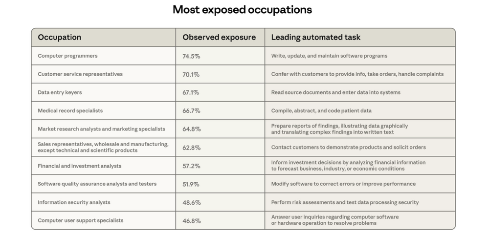 巧合的是,Anthropic的劳动力报告中也单独列出这些职业,其中计算机程序员暴露度达74.5%,客服代表70.1%,数据录入员67.1%,病历专员66.7%。