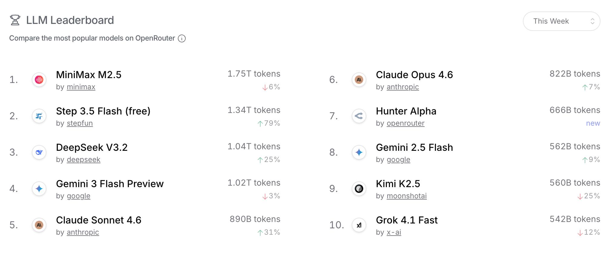 上周调用量前十的大模型中,一款名为“Hunter Alpha”的神秘模型新进入榜,周调用量0.666万亿Token,位列第七。资料显示,Hunter Alpha是拥有1万亿参数和100万Token上下文的前沿智能模型,专为智能体应用打造,擅长长期规划、复杂推理和持续多步骤任务执行,且具备OpenClaw等框架所需的可靠性与指令执行精度。