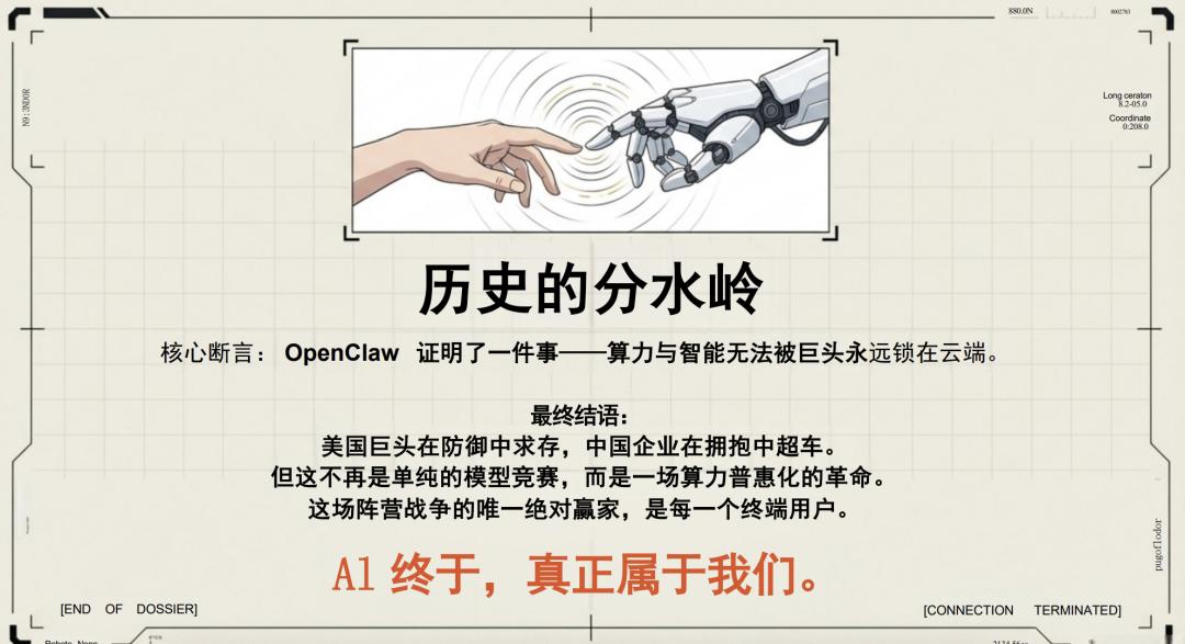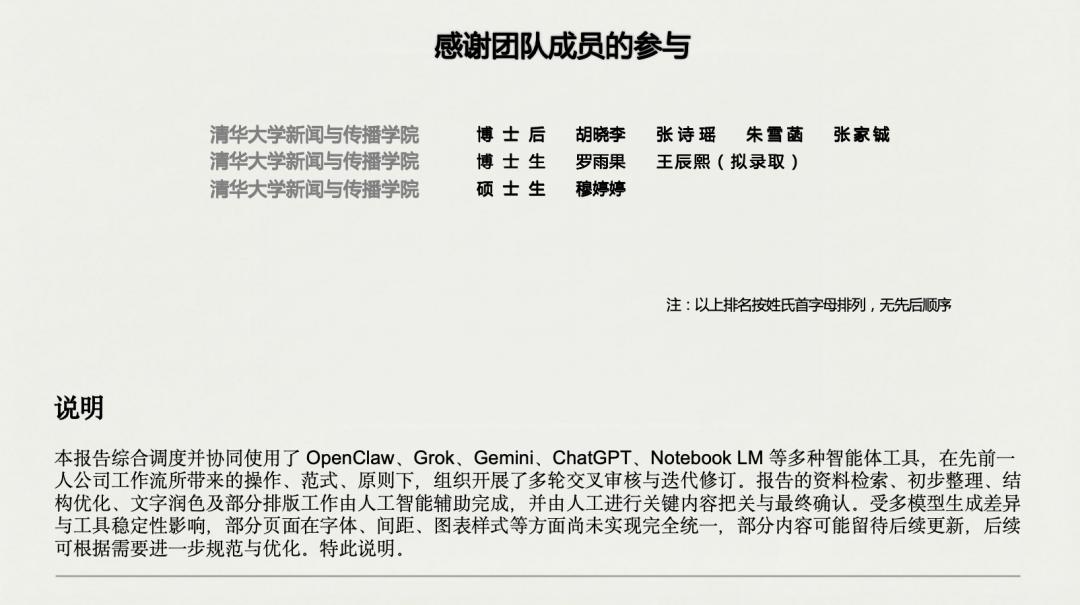 《OpenClaw发展研究报告1.0》以一人公司工作流的操作、范式和原则为基础,经过多轮交叉审核与迭代修订。报告的资料检索、初步整理、结构优化、文字润色及部分排版由人工智能辅助完成,关键内容则由人工把关并最终确认。