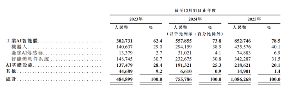 收入结构亦在变化:思谋科技正从项目型机器视觉业务,向产品化与平台化模式转型。核心业务“工业AI智能体”收入占比从62.4%提升至78.5%,三年复合年增长率达67.8%。