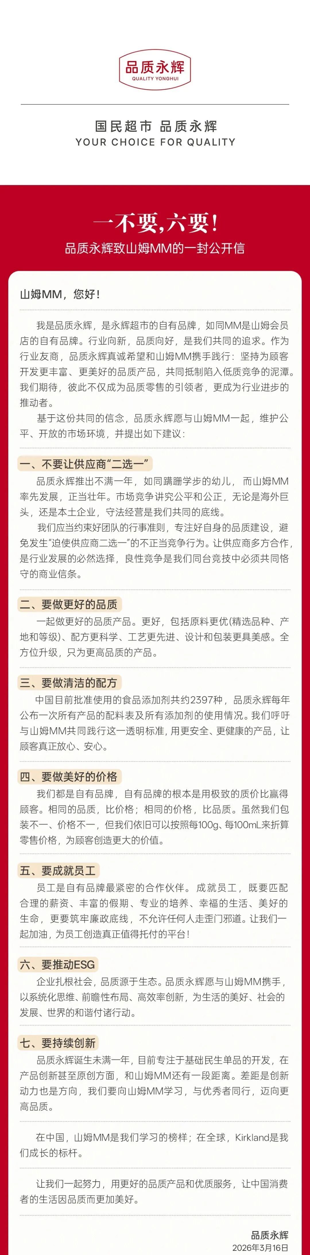 3月16日,永辉超市旗下自有品牌“品质永辉”通过官方公众号发布《致山姆MM的一封公开信》,将山姆会员店自有品牌作为对标对象,向行业发出关于公平竞争、品质共建的联合倡议。