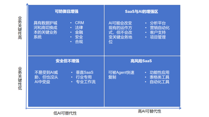 当前行业现状是:AI对SaaS的影响正从右下象限的高风险产品开始,逐步向其他象限蔓延。