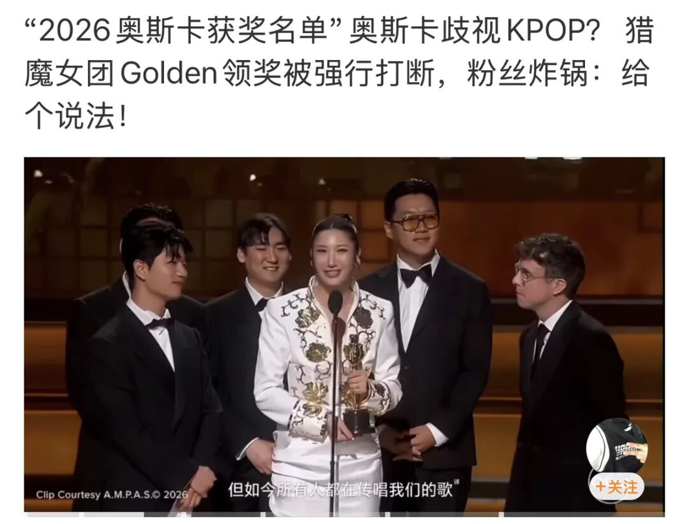 值得注意的是,《K-POP:猎魔女团》团队的获奖感言被主办方用音乐强行打断,这在韩国引发“不尊重”的声讨。这提醒我们:获奖不代表真正被尊重。