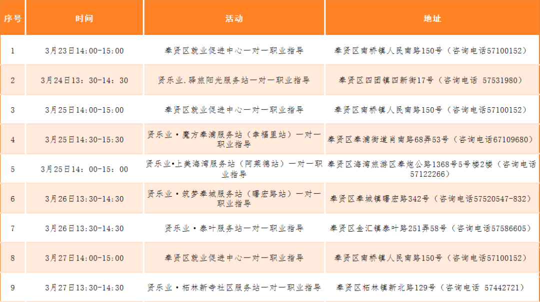 原标题:《奉贤区“15分钟就业服务圈”本周站点活动安排》