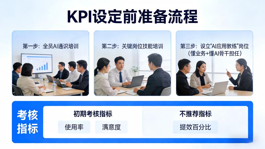 正确做法:设定KPI前完成全员AI通识培训和关键岗位技能培训,设立“AI应用教练”岗位,由懂业务又懂AI的骨干担任,用“使用率”和“满意度”替代“提效百分比”作为初期考核指标。