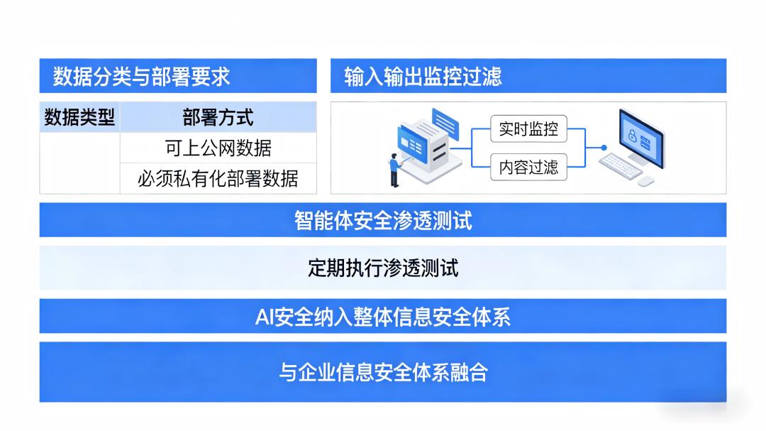应对措施:制定企业级AI使用规范,明确数据使用边界,对输入输出实时监控过滤,定期进行安全渗透测试,将AI安全纳入企业整体信息安全体系。