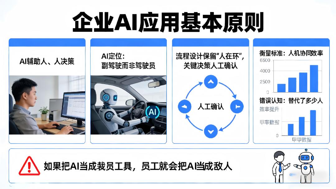 这是对AI角色的根本性误判。AI带来的是“增强化”而非自动化,它提供决策参考,最终决策、执行及异常处置仍需人。若把AI当裁员工具,员工就会把AI当敌人,全员抵触的系统难以运行。