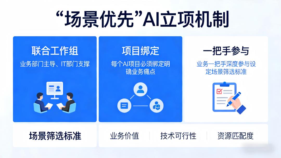 建立“场景优先”的AI立项机制,每个AI项目需绑定明确业务痛点,成立业务部门主导、IT部门支撑的联合工作组,业务一把手深度参与场景筛选,标准为高频、高价值、数据可获取、容错空间可接受,并定期回溯验证ROI;设立AI价值看板,将响应时长缩短、人工干预率下降、客户满意度提升等可量化指标作为验收硬门槛,倒逼技术方案扎根业务。