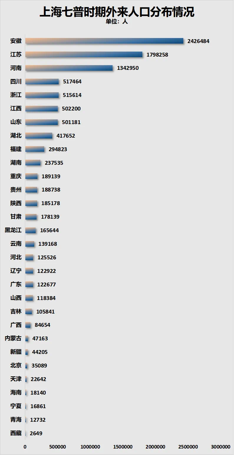 上海在七普时期有1047.97万外来人口,其中安徽籍人口最多,达到242.65万人,差不多每四个上海外来人口中,就有一个是安徽人。