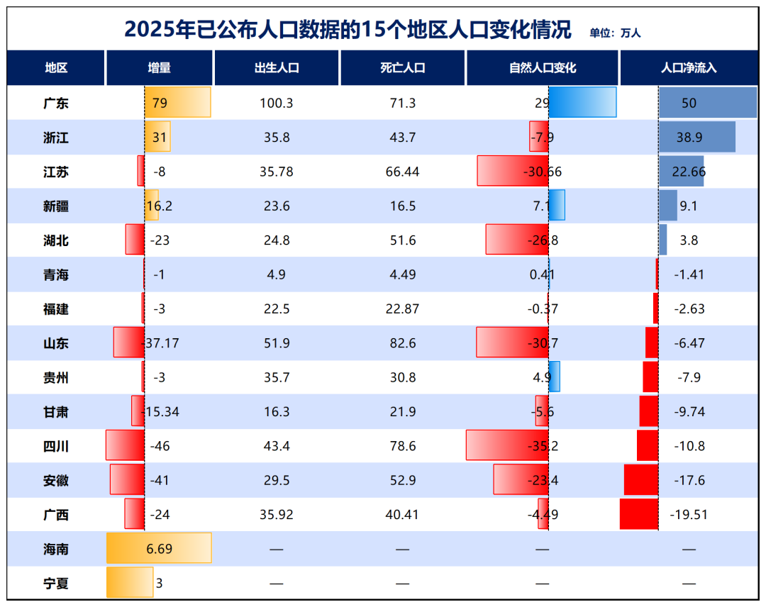从上述15个地区的人口净流入情况来看,广东、浙江、江苏的人口净流入量位居前三,且都达到了几十万的规模。