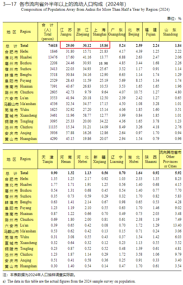 安徽省统计局公布的年鉴数据显示,2024年安徽流向外省的74618人中,有30.12%流向了浙江,29%流向了江苏,15.86%流向了上海。