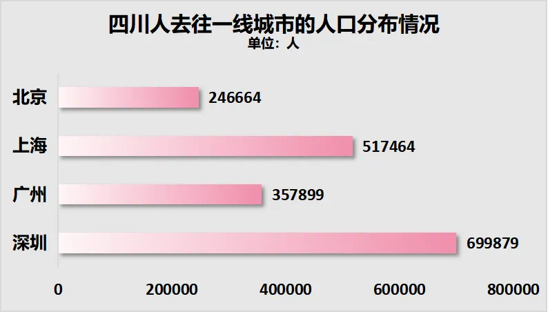 四川去往深圳的人口有70万,去上海的有51.75万,去广州的有35.79万,去北京的有24.67万。