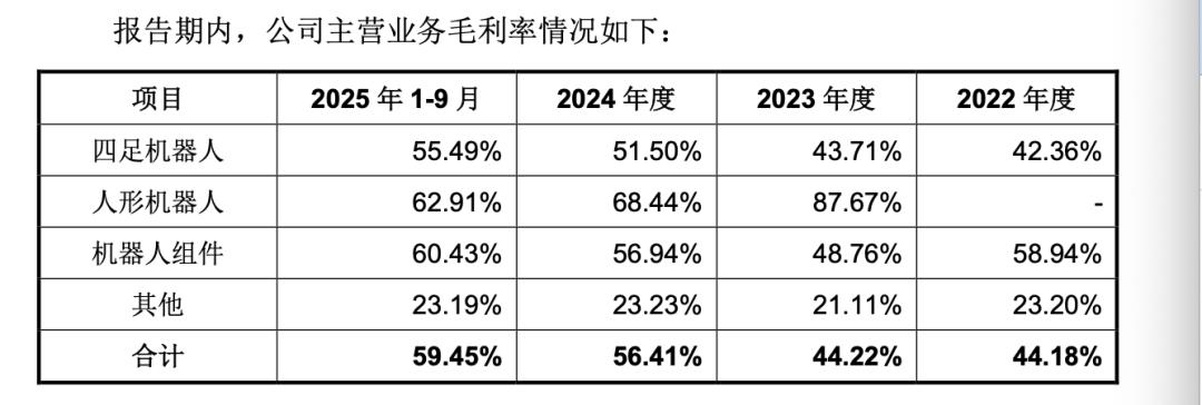 3月20日,宇树披露IPO前招股书,其中2025年前三季度59.5%的整体毛利率数据引发关注。其业务涵盖四足机器人、人形机器人及机器人组件(如灵巧手、协作机械臂、激光雷达等),三项业务毛利率分别达55.5%、62.9%、60.4%,除早期人形机器人外,其他业务毛利率近四年稳步上升。