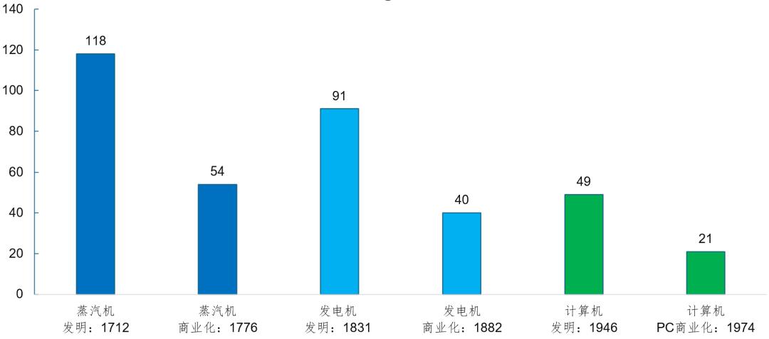 图 通用目的技术从发明和商业化到明显提升生产率的年限,数据来源:根据Nicholas Crafts(2018)、Paul David(1990)、Stephen Oliner & Daniel Sichel(2000)和欧洲央行(2020)数据整理。