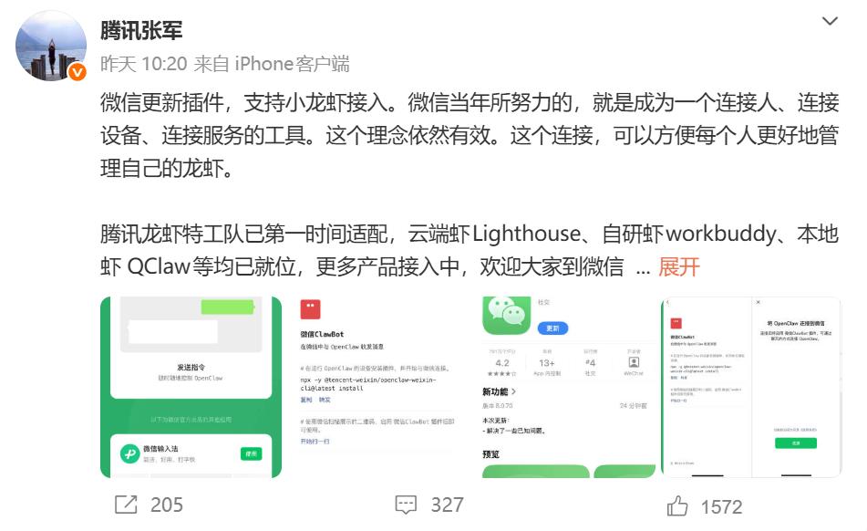 微信试探Agent的同时,腾讯高层也通过“小龙虾”讲述AI故事。马化腾为“龙虾全家桶”站台,预告“更多产品将推出”,并在业绩沟通会上首次谈及养虾战略:“中心化与去中心化需结合。”