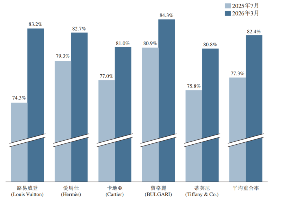 b)渠道端:针对年消费50万元以上的黑金卡会员成立高客(VIC)管理部,每家门店配备专属服务团队,提供一对一导购、私密试戴等定制服务,强化高端体验。数据显示,老铺黄金与LV、爱马仕等五大奢侈品品牌的消费者重合度从上半年77.4%提升至82.4%,表明其正从奢侈品市场抢占份额。