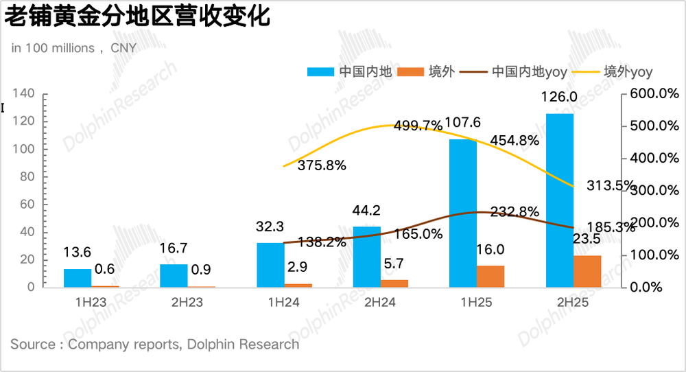 地区分布上,海外营收23.5亿元,同比增长314%,占比从13%升至15.7%。香港地区因ifc旗舰店开业,收入同比增长超400%;新加坡滨海湾金沙店客流量与客单价超预期,单店营收超10亿元,显示产品力在海外华人圈认可度较高。国内营收126亿元,同比增长185%,通过全渠道共振打破增长瓶颈质疑。