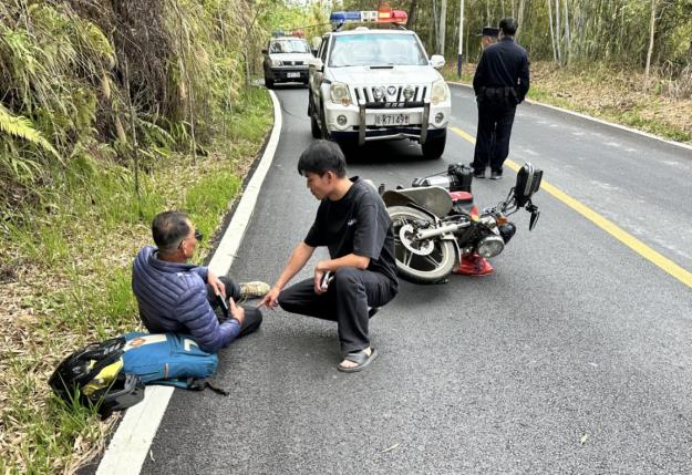 3月17日23时30分左右,胡雄斌和丘英良在休假驾车途中,行至茂名信宜市怀乡镇揽窝村路段,发现一辆载有3人的摩托车失控坠入田中,车上人员均有不同程度受伤。周围围观群众因缺乏专业救援知识,不敢轻易上前帮忙。见状,胡雄斌和丘英良立刻拨打报警电话,随后按照救援规范仔细检查伤者伤情、安抚伤者情绪、监测生命体征,并做好现场安全防护。待救护车到达后,两人将伤者安全移交给医护人员,还向现场交警详细交接了处置情况。他们这一系列专业且规范的救援行动,让现场群众纷纷竖起大拇指。