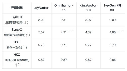 客观评测显示,JoyAvatar在唇形同步、身份稳定与动作自然度上达到商用标准。其中唇形同步相似度Sync-C达5.57,高于Omnihuman-1.5、KlingAvatar2.0及商用模型HeyGen;手部关键点置信度HKC为0.87,保障肢体动作自然流畅。