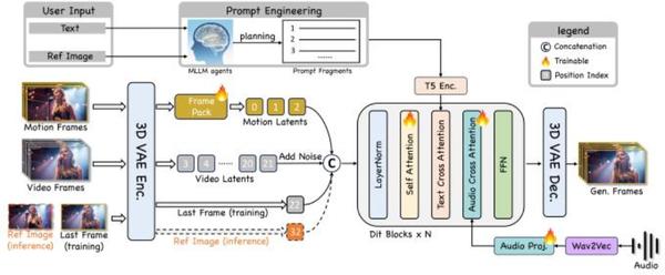借助Frame pack历史帧编码模块与伪最后一帧策略,框架构建专属长视频生成模型结构,突破传统数字人模型“生成时长短、帧闪烁、身份漂移”的限制,支持30秒以上长视频生成,且全程保持身份稳定、动作流畅。
